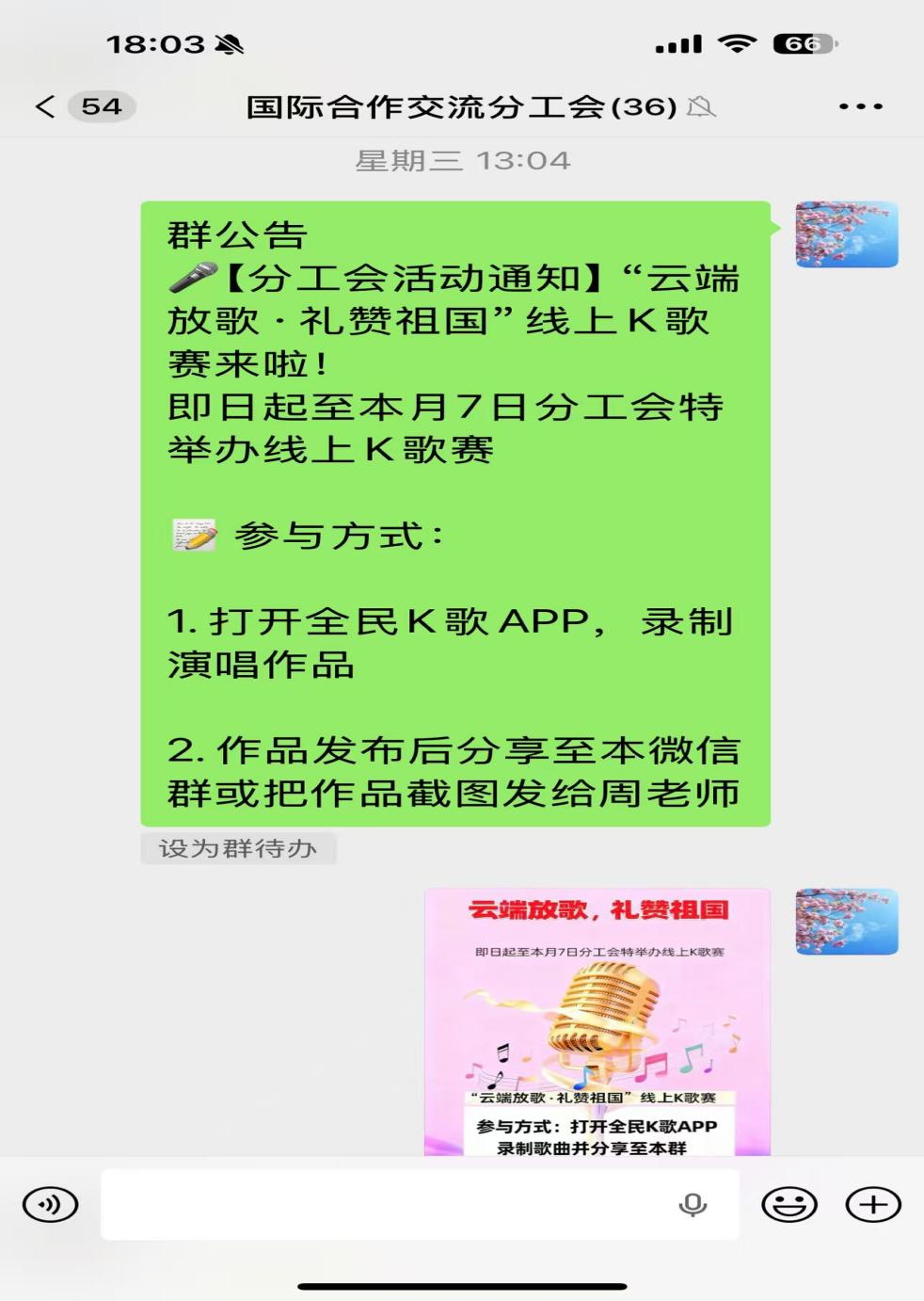 为活跃教职工的业余生活、缓解工作压力,传承红色经典、唱响时代主旋律,国际合作交流分工会于12月3日至7日举办了“云端放歌 礼赞祖国”线上K歌赛活动。