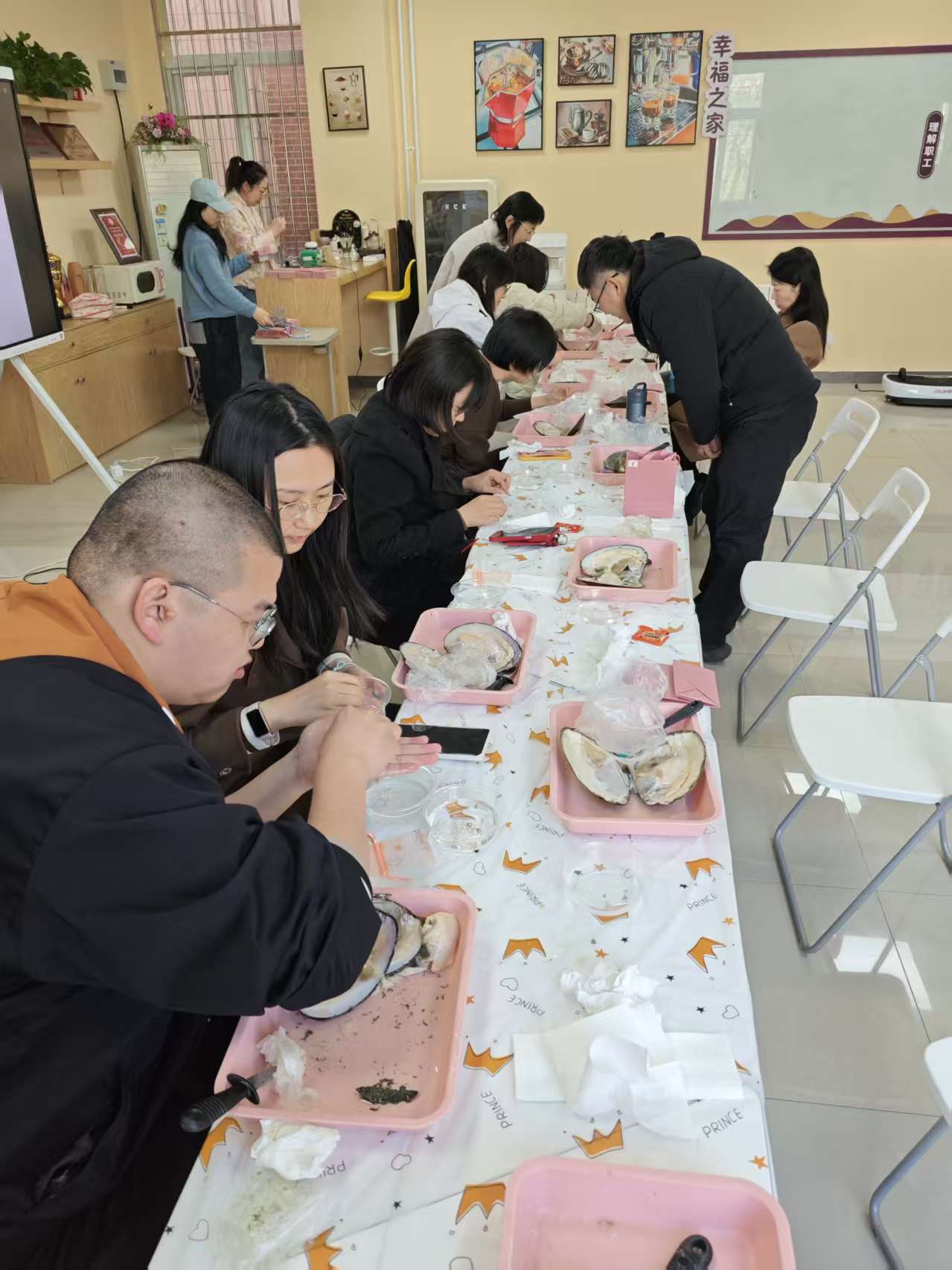 活动现场气氛热烈。面对形状各异的珍珠蚌,老师们满怀期待地动手操作,随着蚌壳开启,一颗颗色泽温润、形状独特的珍珠跃然眼前,引来阵阵惊喜的赞叹。在后续的设计环节,有的老师用开出的单颗珍珠精心制作成雅致的胸针或戒指,尽显简约之美;也有的老师将收获的多颗珍珠组合搭配,设计制作成精巧的耳环或手链,更富灵动韵味。