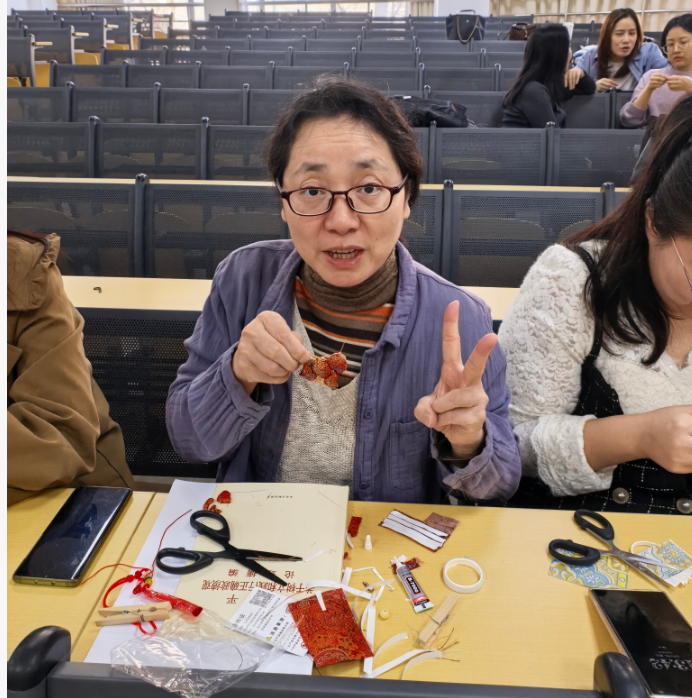 经过约40分钟的精心制作,一个个色彩雅致、造型别致的宋锦小马挂件逐渐成型。大家纷纷展示自己的作品并合影留念,在手工创作的过程中感受传统文化之美,也为繁忙的教学科研生活增添了一份惬意与温暖。