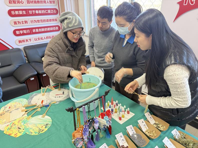 活动现场,老师们在专业指导人员的带领下,亲手体验了漆扇绘制与香囊制作两项传统手工艺。漆扇制作环节中,大家细心调色、巧妙构图,将一抹抹流动的彩漆转化为独一无二的扇面艺术;香囊制作则充满药香与温情,教职工们精选艾草、丁香等中草药,制出兼具美观与实用性的香囊。现场气氛轻松愉快,老师们彼此交流制作心得,分享创作灵感,在忙碌的工作之余享受了一段静谧而充实的手作时光。