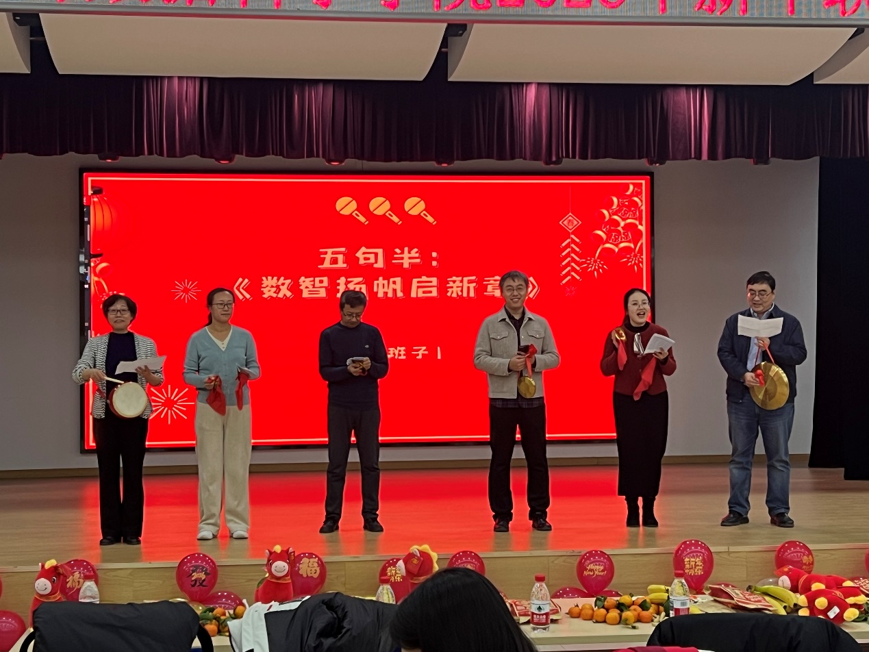 院长致辞结束后,精彩节目轮番上演。学院班子成员带来的五句半《数智扬帆启新章》率先登场,将学院发展特色与新春祝福融入诙谐幽默的台词中,节奏明快、朗朗上口,既展现了领导班子的亲民风采,也道出了全院师生携手奋进的决心,瞬间点燃了现场气氛。