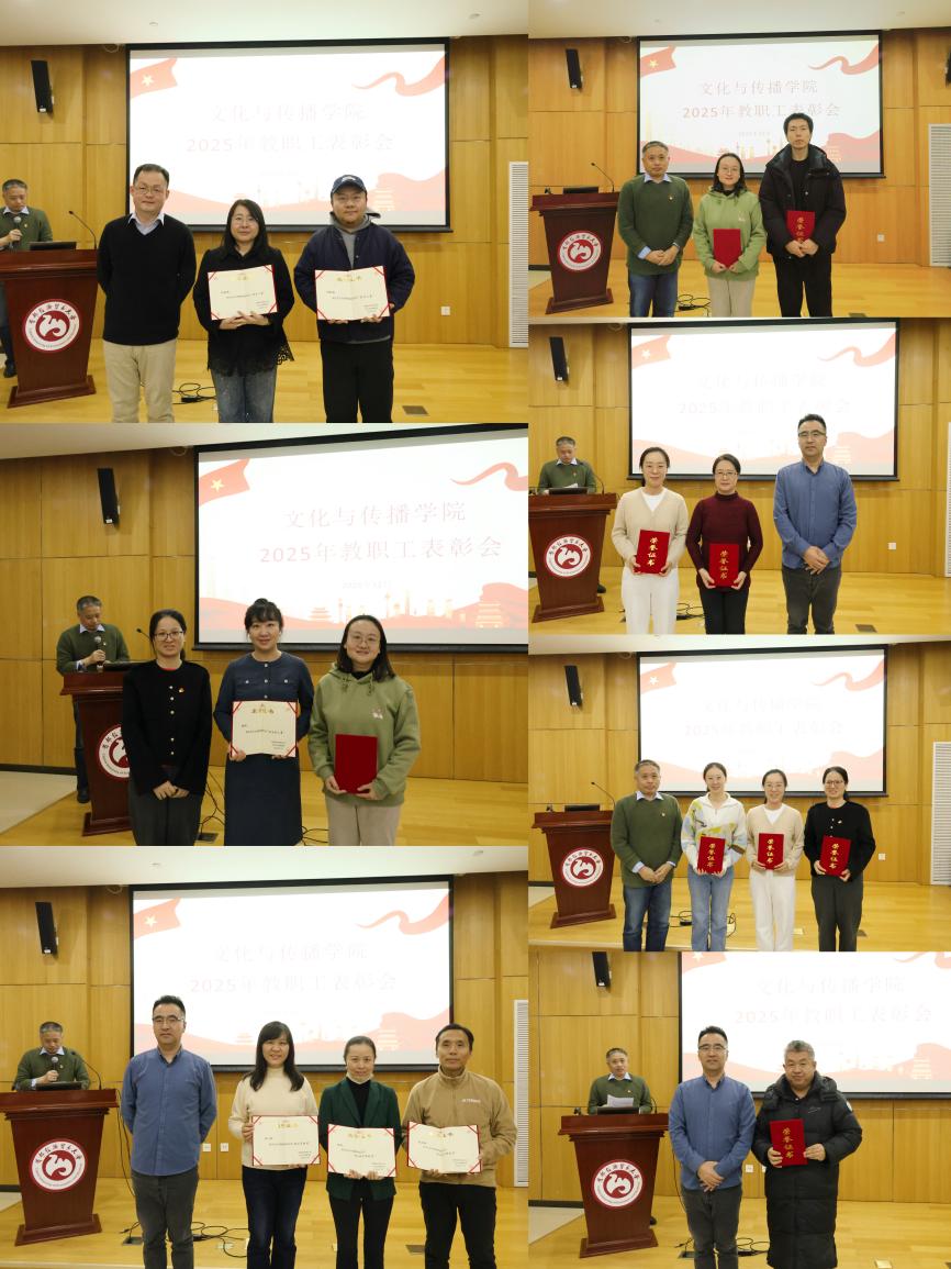 在教职工大会结束之后,学院进行了教职工表彰会议,为2025年各方面工作做出突出贡献的老师们颁发了奖状,他们是年度科研之星——郭媛媛、关家敏;教学之星——刘骏晟、李芊芊、许敏玉;班主任之星——刘吉冬、王端;教学贡献奖——郭媛媛、贺心颖;教学特别奉献奖——毛琦、吴三军;就业工作卓越奖——刘吉冬;就业工作特别贡献奖——王子扬;科研特别贡献奖——李芊芊、司新丽、高冉、刘念;党务之星——刘念、朱红霞;宣传思想文化工作先进个人——郭奕彤;年度团队之星——《大家美育课》录制团队。这些奖项的颁发,不仅是对获奖者个人努力的肯定,更是对全体教师辛勤付出的鼓舞。