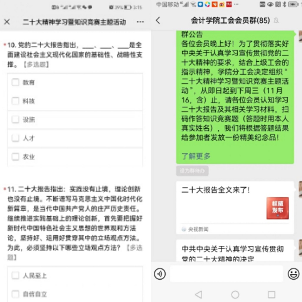 11月10日,为贯彻落实好中央关于认真学习宣传贯彻党的二十大精神的要求,结合上级工会的指示精神,会计学院分工会通过线上答题以及线上学习的方式,组织“党的二十大精神学习暨知识竞赛主题活动”。活动由会计学院全体教职工参加。