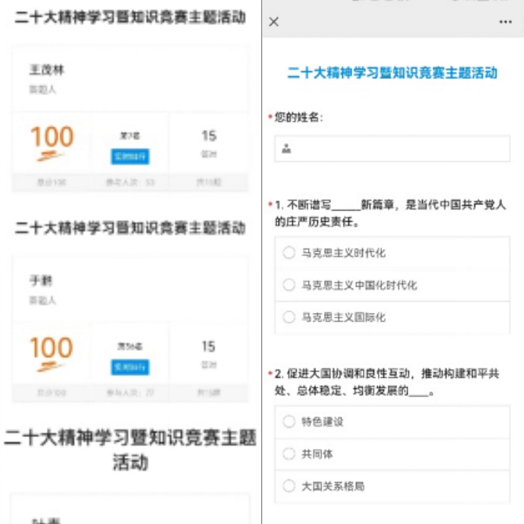 线上答题前,会计学院工会主席蔡立新在线上分享了党的二十大报告全文、中共中央关于认真学习宣传贯彻党的二十大精神的决定、习近平总书记的重要讲话内容等相关学习资料,提供给会计学院全体教职工学习和交流。同时,为强化学习效果、丰富学习方式,采用计时答题模式进行知识竞赛,题目涉及二十大报告、党的二十大精神解读等内容。