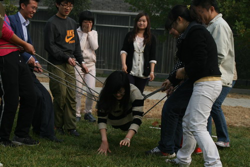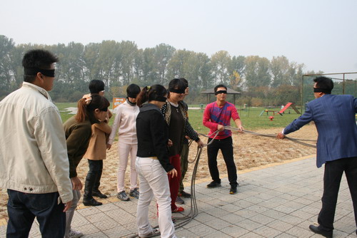 最后又进行了拓展训练。双方单位职工混合组建成为两队,队员们集思广益,分别进行了团队设计,产生了队名、队歌、口号、LOGO……,写在队旗上并签上每一个人的名字留作纪念。大家在拓展过程中互相帮助、团结协作,最终在大家的共同努力下完成任务。