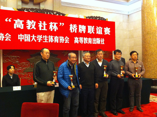 由中国大学生体育协会、中国桥牌协会联合主办,高等教育出版社协办的第十届“高教社杯”北京市高校迎新春桥牌联谊赛于2015年1月3日在人民大会堂举行,教育部、高等教育出版社、中国教育报、在京各高校师生共32支代表队参加了比赛。教育部、国家体育总局、高等教育出版社等单位的有关领导出席并致辞。比赛采用瑞士移位制,经过5轮30副牌的激烈角逐,我校张杰、旷野等组成的教工代表队以63.35VP的成绩获得第五名。