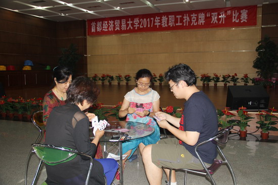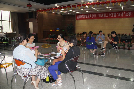 校工会于6月20日起举办了为期一周的2017年教职工扑克牌“双升”比赛,此项比赛是2017年教职工羽毛球、扑克牌、乒乓球联赛的第二项比赛,来自23个分工会的118名教职工经过抽签组成59个参赛队,采用单淘汰赛计时制的形式进行比赛。