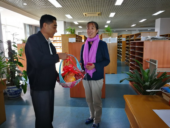 “每逢佳节倍思亲”,在中秋佳节之际,校工会副主席韩邦利、工会专职干部苏静携水果和“经贸饼”,到图书馆总服务台、博学楼东侧阅览室慰问坚守岗位的馆员们,送上校工会的节日祝福与“教职工之家”的温暖。