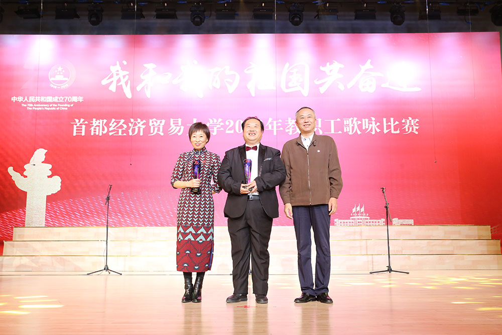10月23日,首经贸博远楼琢玉讲堂上空歌声嘹亮,由校工会举办的“我和我的祖国”教职工歌咏比赛在这里隆重举行,校党委书记冯培,校党委副书记、工会主席徐芳,副校长王传生、王永贵出席此活动。