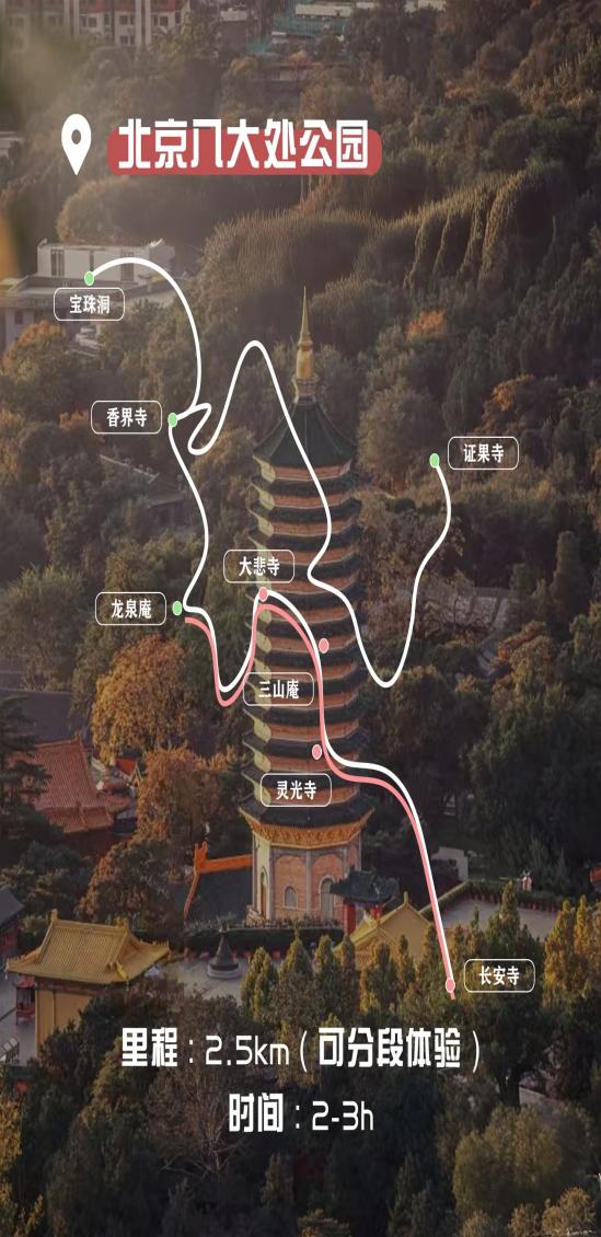八大处公园位于北京市石景山区西山风景区南麓,是国家AAAA级景区、全国重点文物保护单位,也是京城近郊历史悠久、文脉深厚的佛教山地园林与都市山林 。 公园由翠微山、平坡山、卢师山三山环抱,总面积332公顷,最高峰海拔464米,森林覆盖率高、气候宜人,是天然“城市氧吧” 。因园内保存长安寺、灵光寺、三山庵、大悲寺、龙泉庵、香界寺、宝珠洞、证果寺八座千年古刹而得名“八大处”,寺庙始建于隋、唐、宋、元、明各朝,多为皇家敕建,建筑与造像保存完好。 园内以三山、八刹、十二景著称,春有杏林、夏有浓荫、秋有红叶、冬有晴雪,四季皆景;山间步道平缓规整,台阶清晰安全,非常适合徒步健身、休闲观景 。核心看点包括灵光寺佛牙舍利塔、大悲寺元代罗汉像、香界寺皇家寺院格局、宝珠洞登高远眺京城全景等,文化与自然价值兼具。