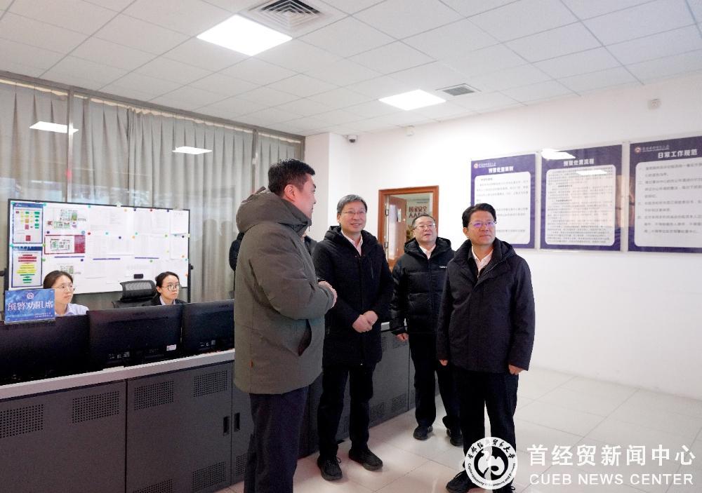 校领导一行来到保卫处校园安全管理服务中心监控室,与值班人员亲切交谈,详细了解寒假春节期间校园安全巡查、应急处置等工作安排,对安保人员坚守岗位守护校园平安的付出表示感谢。校领导又走访了超市、6号学生公寓、校医院、北门值班岗,仔细询问假期货品供应、住宿保障、医疗服务、出入校管理等情况,叮嘱工作人员做好节日期间服务保障,让留校师生感受到家的温暖。